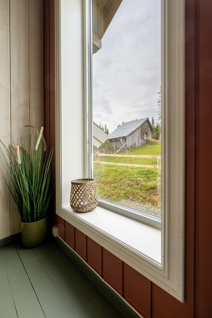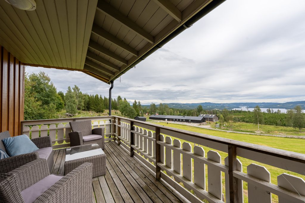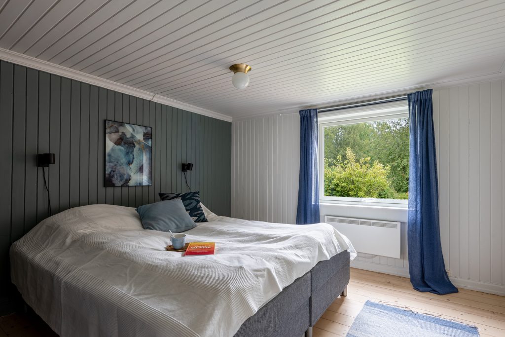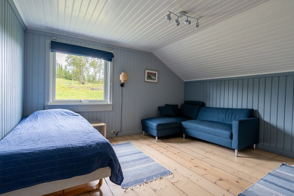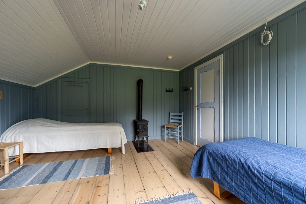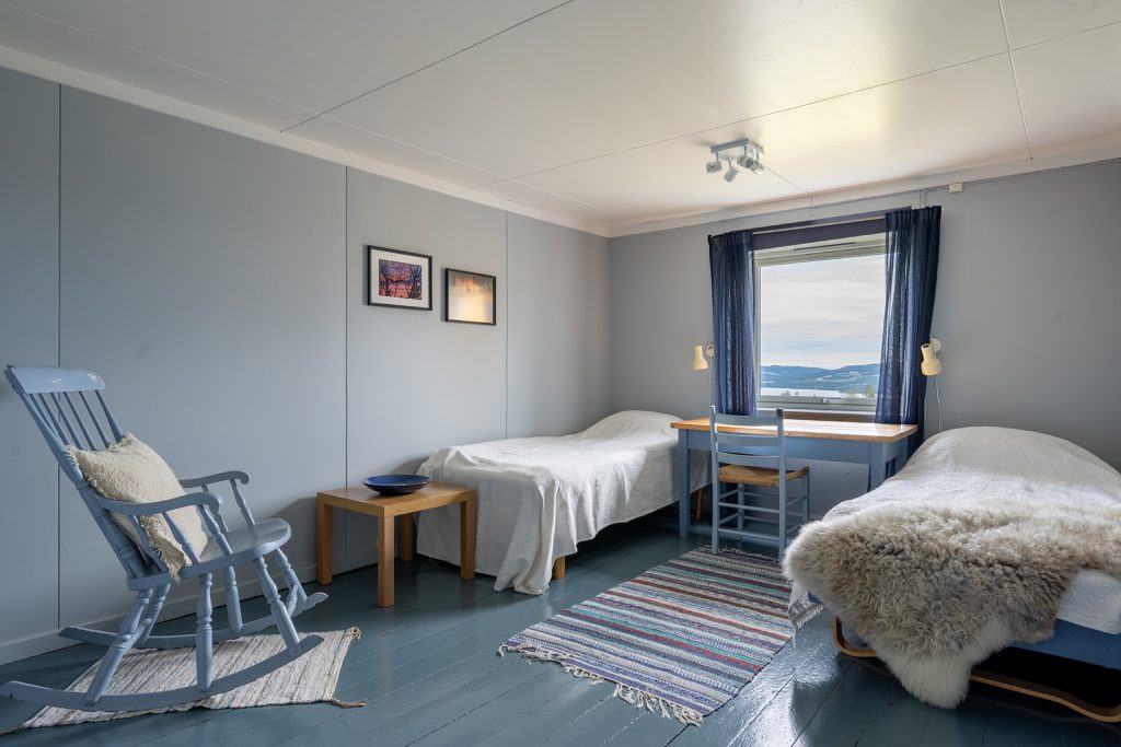 Det er tre soverom med to senger på hvert rom. Det er gode enkeltsenger, men som også kan settes sammen til dobbeltseng. Det er utsikt over beite, skog og hage.