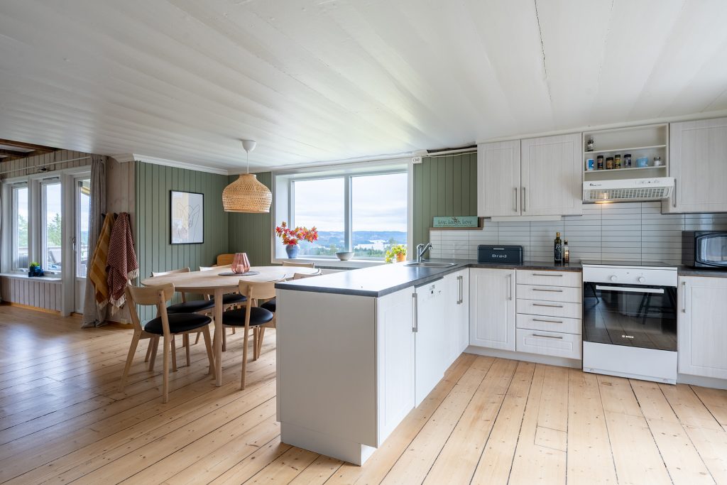 Det er stue med peis og åpen kjøkkenløsning. På kjøkkenet er det egen peisovn. Kjøkkenet er fullt utstyrt. Gjestene tilbereder mat selv her, enten medbrakt eller matkasse som vi leverer.